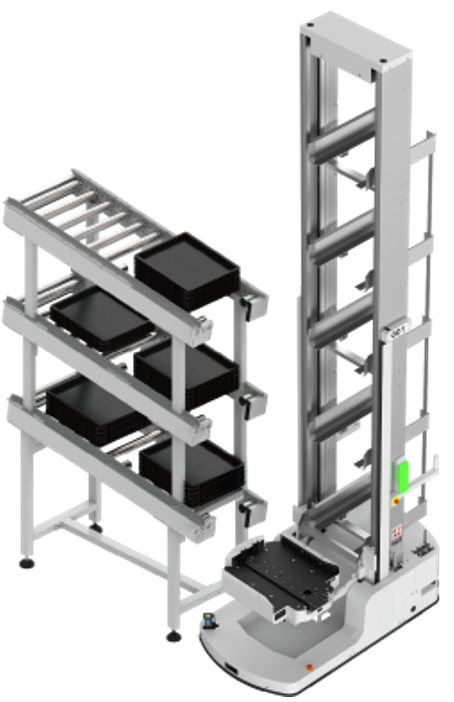 機身小巧,具備自主導航、主動避障與自動充電;可與料箱型 AMR 協作,將料箱由儲區快速送至工作站。可選配觸控螢幕與安全背心,兼顧效率與作業安全。