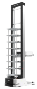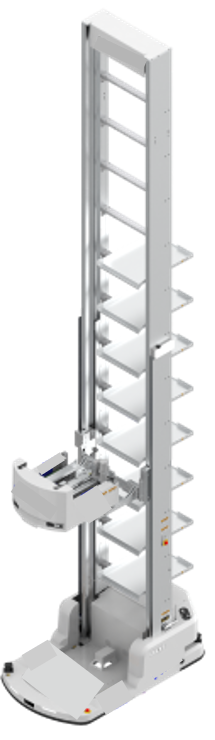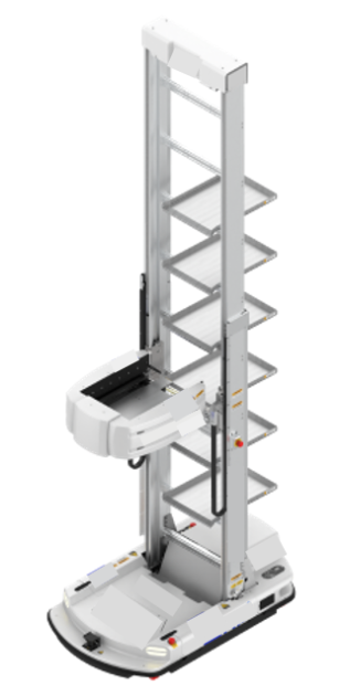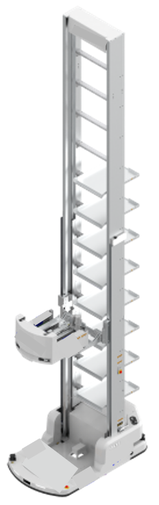 針對高位貨架與淨高較低的通行區所設計,可在倉內完成高效率的揀選與搬運。最高取貨高度可達 10 公尺,相容最大 850×650 mm 箱規;可依規劃進行跨防火區域作業,充分利用倉庫淨高,提升單位面積的儲位數。可與既有倉儲、製造系統串接以提升坪效。全程無須軌道設備,並具備自主導航、主動防碰撞與自動充電。